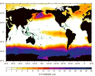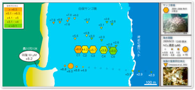 サンゴ礁は硝酸濃度が低い(白い部分)に分布している