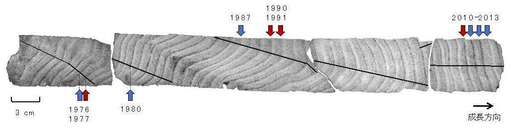 *3 骨格成長指標・・・本研究で用いたサンゴの骨格成長指標は,骨格密度,骨格伸長量(骨格成長量),石灰化量の3種類である。造礁サンゴ骨格に軟X線を照射し撮影した画像からは,造礁サンゴ骨格の年輪を観察できる(図1)。この画像と化学分析の時系列データを組み合わせて分析することで,骨格成長指標を算出する。