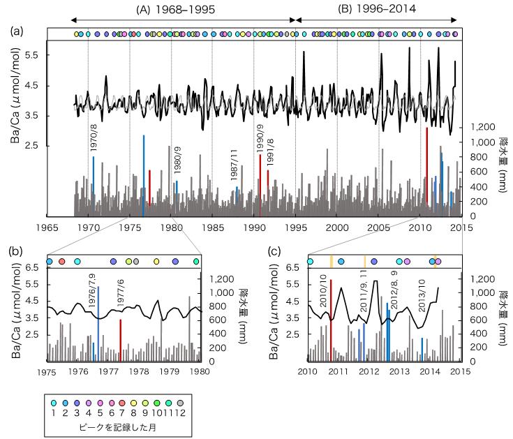 (a)サンゴ骨格中のBa/Ca(黒線)は海水中の土砂流量を反映。ピーク値を記録した値を示す月を12色で,降水量のデータのうち 洪水を伴わない豪雨は青色,洪水を伴った豪雨は赤色で 示す。豪雨・洪水イベント後はピークが確認され,これは豪雨・洪水イベントによって河川を 経由して土砂が湾内へ流れ込み,一時的に海水中の土砂流量が増加したことを示す。