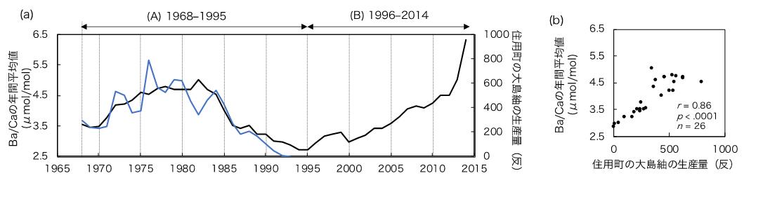 (a)図中の黒線は,数十年規模のBa/Ca比を示す。図中の青線は住用町における大島紬の年間生産量を示す。両者の変動パターンは非常によく似ていた。