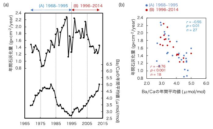 (b)両者の間には有意な強い相関関係がみられた。サンゴ骨格は,沿岸域で繁栄した大島紬の生産に伴った泥・土砂の湾内への流入を記録していた。
