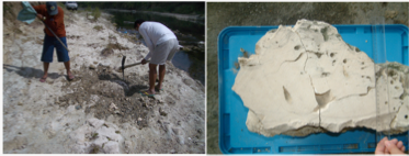 造礁性サンゴの骨格には過去の大気と海洋の環境変動が数週間という高時間分解能で記録されています。渡邊らは,フィリピンでの地質調査により鮮新世温暖期に相当する地層から非常に保存状態のよい化石サンゴを発見しました(図2)。それらの化石試料から電子顕微鏡観察やシンクロトロン光を用いたエックス線回折実験により骨格に変質がないことを厳密に確認し,2つのサンゴ化石を化学分析用の試料として選びました。そして,2つのサンゴ化石の酸素同位体比組成(水温と塩分の指標)から,計70年分の大気と海洋環境の季節変動および経年変動パターンを抽出しました。今回のサンゴ化石が採取されたフィリピン周辺の海域は,水温と塩分の変動がエルニーニョ現象の影響を強く受けている場所であり,現生サンゴの酸素同位体比の変動パターンは,現在のエルニーニョ現象の変動パターンをよく記録していることがわかっています。本研究では,化石サンゴの酸素同位体比の変動パターンを,現生サンゴの酸素同位体比変動パターンと比較することによって,鮮新世温暖期におけるエルニーニョ現象の有無を検証しました。