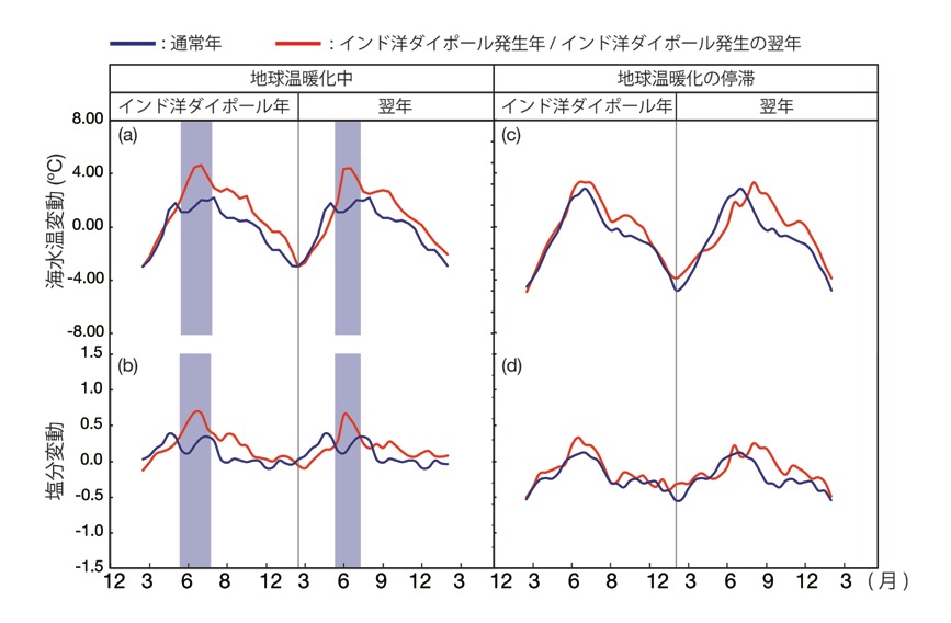 その結果、地球温暖化の停滞時、西インド洋の海水温はインド洋ダイポール現象とは独立的に変化し、低下していたことが示唆されました。